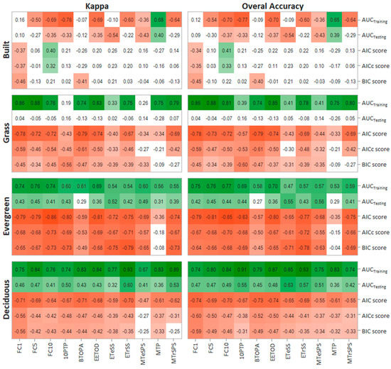 Correlation analysis between model quality and classification accuracy metrics show that there is a relationship between the statistical quality of the model and the accuracy of classification results, but the degree of this association largely depends on the land-cover under analysis (Figure 2). For example, while for built cover there seems to be no consistent relationships between model quality and classification accuracy, for grass, evergreen and deciduous cover there are some clear and consistent association patterns. For the three vegetation covers, AUCTraining tend to be strongly positively correlated with classification accuracy, whereas AIC, AICc and BIC negatively correlated to the classification metrics. Among this, AIC is the model quality metric presenting the strongest relationships with classification accuracy. AUCTesting is the only quality metric showing contrasting results between vegetation covers. While for grass, AUCTesting shows no relationship with land-cover classification accuracy, for evergreen and deciduous cover shows a positive relationship. These general patterns hold independent of the classification accuracy metric used for the analysis, i.e., Kappa or overall accuracy (Figure 2).