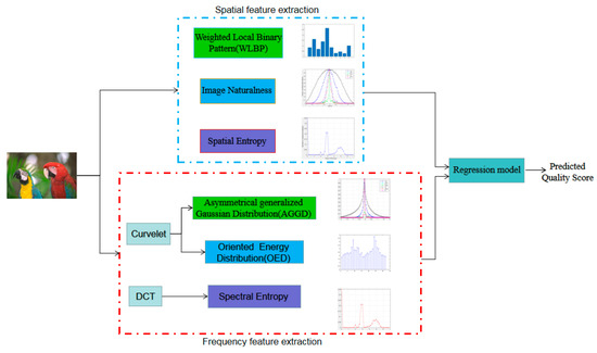 Representative global framework of NR-IQA models include BLIINDS-I [27], BLIINDS-II [28], GRNN [29], BRISQUE [30], and NIQE [31]. BLIINDS-I combined features of contrast, sharpness and anisotropy in discrete cosine transform (DCT) domain by a down-sampling operation on the image and adopted a probability model to predict image quality. BLIINDS-II predicted quality score by using statistical features extracted from local image blocks on the basis of BLIINDS-I. GRNN extracted complementary perceptual features of phase consistency, gradient and entropy, and adopted a generalized regression neural network to establish a mapping between visual features and subjective scores to predict image quality. BRISQUE investigated the statistical rules of images from the perspective of the spatial domain and utilized support vector regression (SVR) to establish a mapping between statistical features and mean opinion score (MOS). NIQE evaluated image quality by measuring the distance between the statistical features of distorted images and natural images. In view of visual perception and statistical characteristics, this paper proposes a novel NR-IQA algorithm based on dual-domain feature fusion, dubbed as DFF-IQA. In the spatial domain, features of weighted local binarization pattern (WLBP), naturalness, and spatial entropy are extracted. In the frequency domain, asymmetrical generalized gaussian distribution (AGGD) fitting parameters of curvelet coefficients, oriented energy distribution (OED), and spectral entropy features are extracted. The features extracted from the dual-domain are fused to form a quality-aware feature vector, and then random forest regression is employed to predict the image quality score. At last, we validate the performance of the proposed DFF-IQA method on the LIVE database. In summary, the main contributions of this work are: