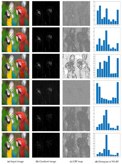 where represents the values of the gradient in four directions of (i, j) pixel point. Then the final weight map is obtained. The gradient magnitudes of pixels with the same WLBP pattern are accumulated , which can be regarded as the gradient-weighted WLBP histogram.