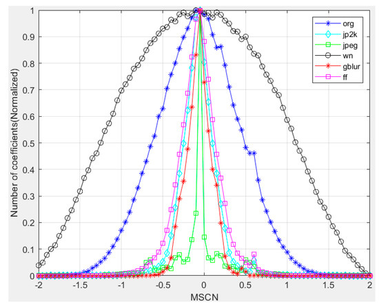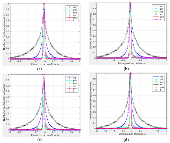 In order to visualize how paired products vary in the presence of distortion, in Figure 7, we plot histograms of paired products along each of the four orientations, for a reference image and for distorted versions of it. Figure 7a–d are the histograms of the pairwise product of the center pixel and horizontal, vertical, main diagonal, and secondary-diagonal MSCN coefficients.