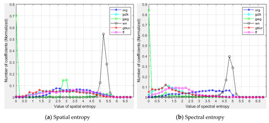 Histograms of spatial and spectral entropy values for different types of distortion. The ordinate represents the coefficient normalized between 0 and 1.
