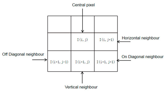 Prewitt filters with horizontal, vertical, main diagonal, and secondary diagonal directions were used to obtain the four gradient images in different directions by convolution operation. They are defined as , where represents the Prewitt filter with four different directions, denotes the input image, and represents the gradient of the four directions. In this work, we use the maximum gradient magnitude O(i, j) calculated by Equation (7) as the LBP weight of each pixel:
