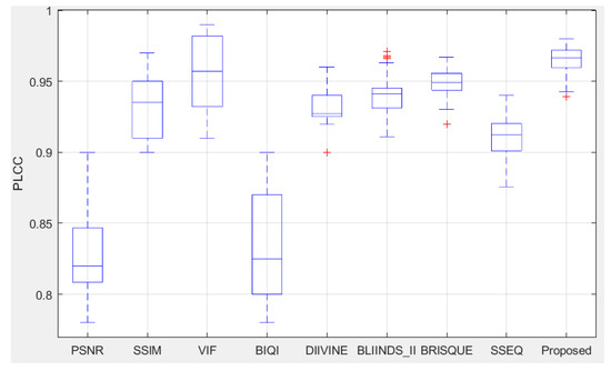 Box plot of PLCC distributions of the compared IQA methods over 1000 trials on the LIVE database.