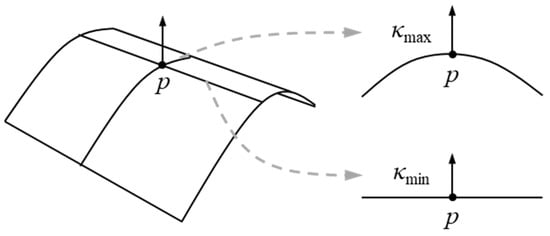 where κmax and κmin are principal curvatures (i.e., the maximum and minimum normal curvature) at p (Figure 1). Information entropy H expresses the randomness of information [], and it is calculated as: