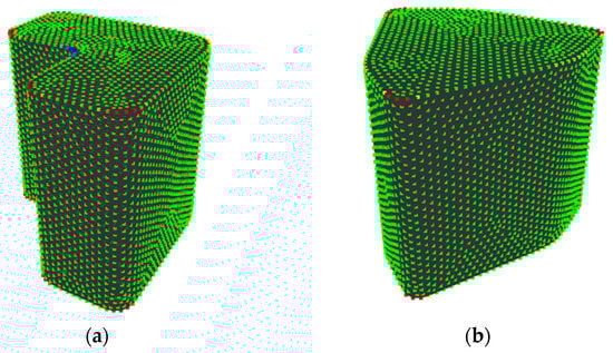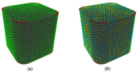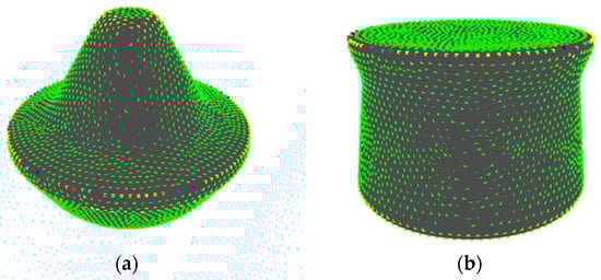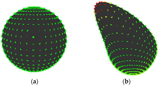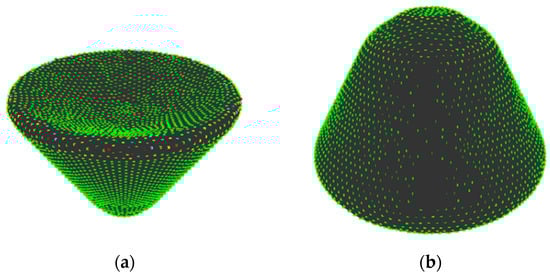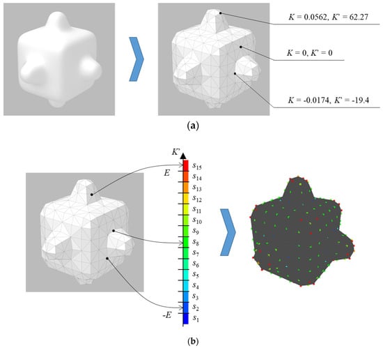 (i) Sample a curved surface shape by dividing the entire shape with equilateral triangles with the same area using the Advancing Front Method (Figure 2a) []. Note that the triangles generated by the method tend to have similar areas and be close to equilateral triangles. The vertices of the triangles are called sampling points and the Gaussian curvature K at point v is approximately calculated, as []: