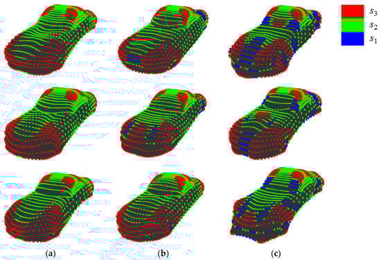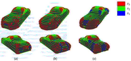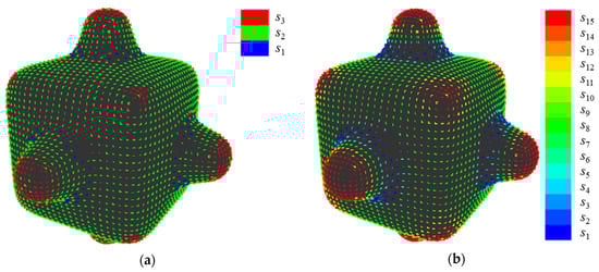 For example, the results of the quantization when {E, V} = {30, 3} and {E, V} = {15, 15} are shown in Figure 4a,b, respectively. In Figure 4a, the points at a concavity or convexity are allotted to the second state s2 as same as points on a plane. Whereas, Figure 4b shows that those points are allotted to different states based on their values of K’. Note that, methods to set parameters, which enables calculating entropy without bias, is proposed []. However, it is necessary to carry out a sensory evaluation to set parameters since it is important to consider human perceived “complexity” in this research. The setting of parameters without carrying out a sensory evaluation is a future task.
