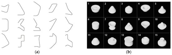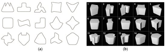 Sample shapes A are created from 2D shapes while using extrusion. In the experiment, 15 shapes (Figure 6a) are randomly extracted from 25 shapes used in the conventional research [] and extruded in a direction perpendicular to the shapes. Note that the extruded distance is set to twice as long as the maximum diameter of each shape (Figure 6b).