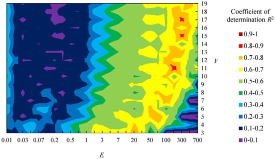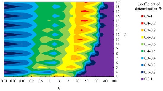 Relationship between parameters (E and V) and coefficient of determination R2 in sample shapes A during cross-validation; (a) Group B1 and B2; (b) Group B1 and B3; (c) Group B2 and B3.