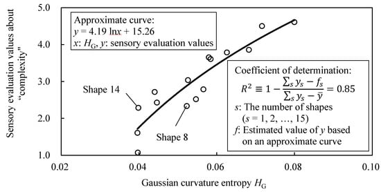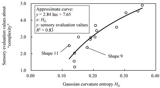 Figure 23 shows the relationship between the sensory evaluation values about “complexity” and the value of HG. The R2 of logarithmic approximation on the relationship is 0.71, and the correspondence between HG and the sensory evaluation values is confirmed. However, there are shapes that deviate from the approximate curve, such as shape 10, 11, and 15.