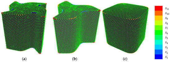 Figure 13 shows an example of quantization when {E, V} = {200, 11}, which presents the highest value of R2. First, the setting of E is discussed, as follows. In shape 11, points at sharp convexities are allotted to s11 while points at concavities are allotted to s1. In shape 13, points in gradual convexities are allotted to s9 or s8, while points in gradual concavities are allotted to s4 or s3. In shape 6, points located out of convexities are allotted to s6. Therefore, it seems that various convexities and concavities of sample shapes A are allotted to different states that are based on their sharpness by setting parameters at {E, V} = {200, 11}.