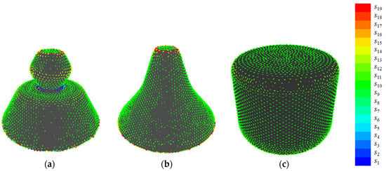 Figure 16 shows the examples of quantization when {E, V} = {50, 19}, which presents the highest value of R2. In shape 8, points at sharp convexities are allotted between s19 and s17, while points at sharp concavities are allotted to s1. In shape 5, the points at gradual convexities are allotted between s15 and s12, while points at gradual concavities are allotted to s9. In shape 6, the points at plane surfaces are allotted to s10. This suggests that the convexities and concavities of sample shapes B are allotted to different states based on their sharpness by setting parameters at {E, V} = {50, 19}. Note that the reason why V becomes an odd number is to prevent overestimating minute unevenness, the same as sample shapes A.