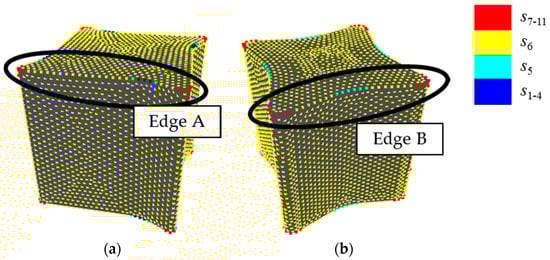 Figure 18 shows shapes 4 and 10 of sample shapes A as shapes corresponding to I rather than HG. In these shapes, sensory evaluation values are 2.71 and 2.79 and values of I are 1.59 and 1.66, respectively. However, values of HG are 0.044 and 0.057, which do not correspond to sensory evaluation values. It seems that this is because states of sampling points on edges are allotted to different states. On an edge of shape 4 (Edge A in Figure 18a), the edge is straight,, except for a bent and the state of the points are s6, since the value of K’ is close to 0. On the other hand, on an edge of shape 10 (Edge B in Figure 18b), the edge is slightly bent and the state around the center of is s5, while the state close to the corner is between s7 and s11. Consequently, the variance of states is larger and the value of HG is higher in shape 10. Therefore, it seems that HG sometimes overestimates a slight difference in a value of K’.