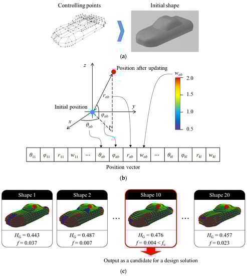 - Set the initial shape (Figure 19a). Subsequently, the initial shape is expressed while using the NURBS surface and Qab and wab of the surface is defined as the position vectors of particles in PSO (Figure 19b). Note that Qab is expressed by polar coordinates whose origin is the position of the controlling point at the initial shape.