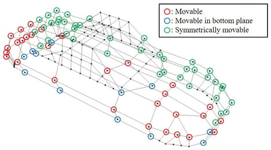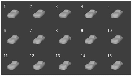 In this research, the method was applied to generate the shapes of Coupe-typed automobiles. At first, the NURBS surface was generated as the initial shape based on controlling points (Figure 20). Note that the movement of the points was constrained, as shown in Figure 20. The value of HG at the shape was 0.322 and shapes are generated by setting five levels of HG,target at 0.30, 0.38. 0.46, 0.54, and 0.62. Note that fu was set at 0.004 and 15 shapes (three shapes at each level) were generated. The reason of setting fu at 0.004 was because of the difference between the levels of HG,target was 0.08. Under this setting, the HG of the generated shape should be between [HG,target – 0.04, HG,target + 0.04]. Subsequently, fu was set at 0.004, which was 1/10 of 0.04. In addition, the parameters of HG were set at {E, V} = {2, 3}. This is because, in the preliminary experiment, the relationship between the sensory evaluation values about “complexity” and the value of HG of shapes generated by random transformation of the initial shape is examined and the R2 of logarithmic approximation on the relationship is maximized when {E, V} = {2, 3}. Figure 21 shows the generated shape examples.