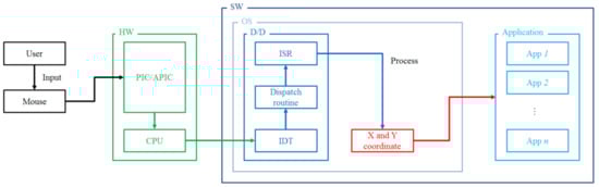 The operating system supports the interaction between the mouse device and the user and manages the cursor position on the screen based on the data transmitted from the mouse device. Data transferred from the mouse device is collected by a device driver for the mouse device of the operating system, and the collected mouse data are transferred to the application program to support the interaction with the user. Figure 1 shows the mouse data transfer process.