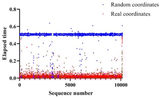 In Figure 2, all points are a distribution of the coordinates according to the elapsed time. The red dots are the real coordinates while the blue dots are the random coordinates. The distribution of random coordinates is relatively periodic and has a distribution close to 0.5, because random coordinates are generated by the defense tool. Conversely, the distribution of real coordinates is aperiodic and has a distribution near zero, because real coordinates are input from the user. Therefore, we hypothesized that it is possible to classify random coordinates and real coordinates based on the elapsed time. Figure 3 shows the distribution of the coordinates with respect to the X coordinate.