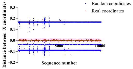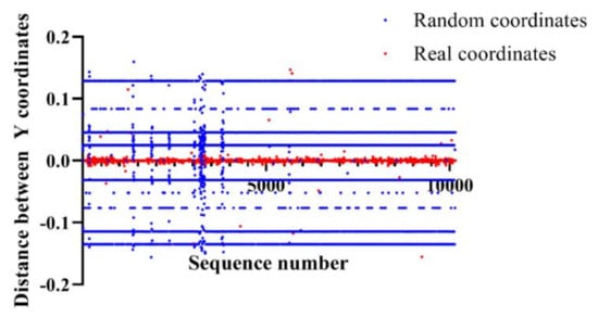 Specifically, all points are a distribution of the coordinates according to the X coordinate. The red dots are the real coordinates while the blue dots are the random coordinates. Random coordinates have an overall wide distribution ranging from 0 to 0.24, while real coordinates have an intensive distribution with a relatively arbitrary range. Therefore, we hypothesized that it is possible to classify random coordinates and real coordinates based on X coordinates. Figure 4 shows the distribution of the coordinates according to the Y coordinate.