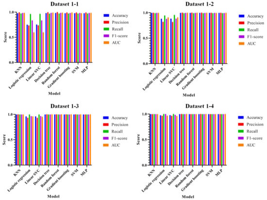 As shown in the table, the training set has the highest score with a Random Forest of 1.0, and the validation set and the test set have a score of 0.98 for most of the models except for Logistic Regression. To evaluate the performance of the proposed attack technique, Figure 7 shows the evaluations of accuracy, precision, recall, F1-score, and AUC for datasets 1-1 to 1-4.