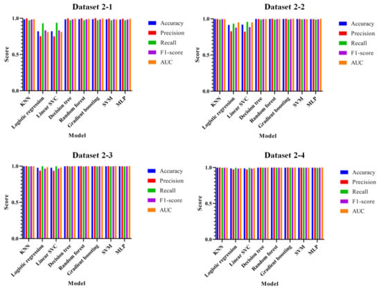 To evaluate the performance of the proposed attack technique, Figure 8 shows the results of each set of accuracy, precision, recall, F1-score, and AUC based on datasets 2-1 to 2-4.