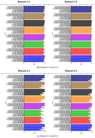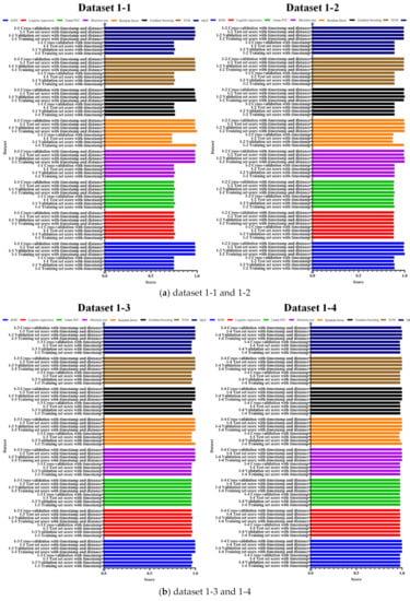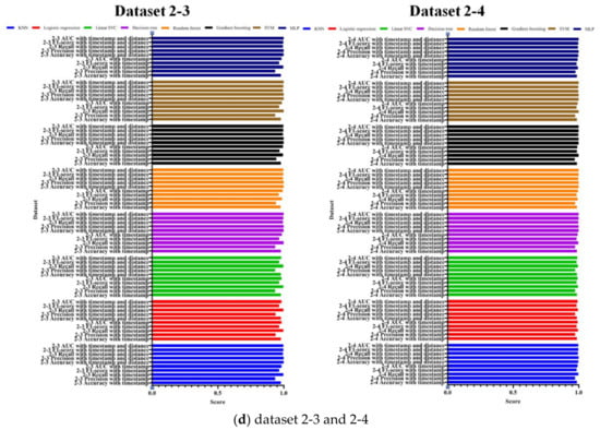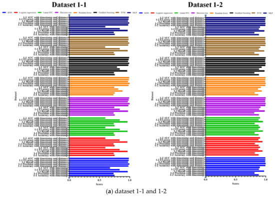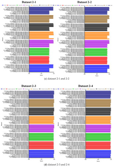 As shown in the figures, the performances of each model are represented by colors. The top four in each model are the results of the datasets that include the distance between the previous and current coordinates proposed in this study, while the bottom four are the results of the datasets that do not include the distance and were used in the previous study. Therefore, the performance of the proposed method is improved in most datasets and machine learning models. An increase in the performance trend was observed from dataset 1 to 4, and on average, all datasets including distance outperformed all the datasets that do not include distance. Moreover, all scores in datasets 1-4 and 2-4 have a near-perfect performance of over 99%, which results in a higher performance for constructing features with datasets containing distances. Regarding the changes in the training set, the validation set, and the test set, the results of most models of datasets that do not include distance have significant changes compared to models of datasets including distance that have relatively small changes.