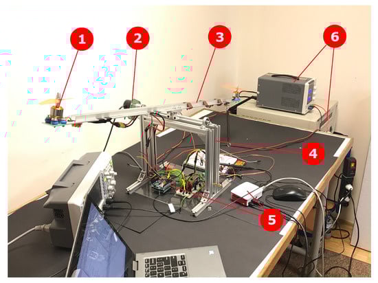 UAV arm testing platform with the BLDC motor and microcontroller (1-BLDC micromotor, 2-high-precision encoder, 3-adjustable arm, 4-rigid frame, 5-controllers, 6-power supply).