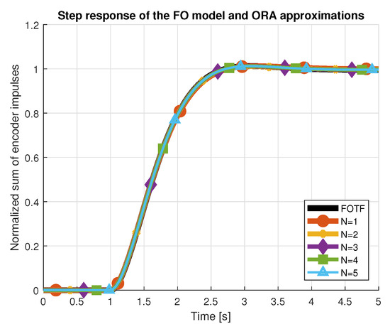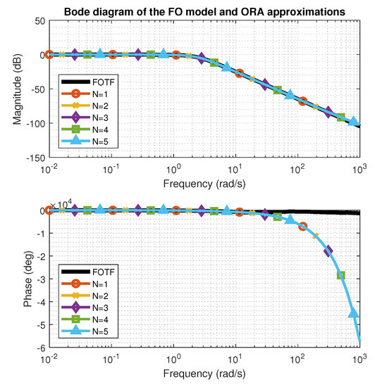 - Discrete non-integer-order plus dead time (DNIOPDT)Discretization of the non integer-order transfer function (3) was performed in three consecutive steps. First, approximation of the transfer function in the frequency domain was obtained by applying Oustaloup’s Recursive filter algorithm (ORA) [10,18], approximating the complex variable s of the fractional order 0 < < 1, using the following formula:where denotes the frequency range of the approximation, N is the order and . As a result, function (6) generates poles and zeros in total. If then is first replaced with , where n is an integer number and u is a fractional part, approximated by the algorithm. Different values for the approximation order N were tested over the selected frequency range Step response and Bode characteristics for are presented in Figure 3 and Figure 4. It is noticeable that all values of the order N provide satisfactory approximations of the initial fractional order transfer function. Nevertheless, we proceeded with approximation orders . Since the approximation polynomials had over 14 zeros and poles, in the second step, a reduction was performed using the balancing reduction technique [19], available in MATLAB as balred method. Minimization of the cost functions for a new reduced-order plant model of a fixed balred order revealed that of several ORA filters, approximation of the order ensured the best match between both characteristics.