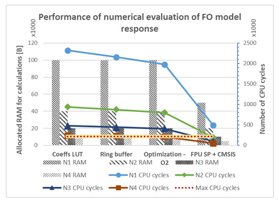 Further optimizations are a topic of the ongoing research involving adaptive memory methods, parallel implementation of numerical algorithms and calculations using fixed-point arithmetic. Finally, assembly inlines placed in critical sections of the algorithms and platform-specific enhancements are being considered. However, these approaches are strictly platform-dependent and must be adopted for each architecture individually. The results of subsequent software optimizations are presented in Figure 8. The algorithm processing past samples, compiled with a –O2 flag, satisfied the initial timing requirement, calculating the output in a time shorter than the sampling period ms.