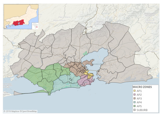 The organization responsible for the demographic census in Brazil is the Institute of Geography and Statistics (IBGE), who follows global standards to aggregate census tracts in subdistrict, district, city, state, and country levels such that this partitioning can be used for most regions in the world and at different scales. This study relies on such partitioning, dividing the study area into 49 locations (Figure 1) whereby the city of Rio is divided into 33 subdistricts aggregated into 5 districts, as shown in Figure 1. Districts are called Planning Areas (AP) and represent macro zones of the city with AP1 the center; AP2, the southern zone; AP3, the northern zone; AP4, Barra-Jacarepaguá; and AP5 depicts the western zone.