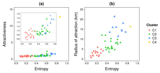Results of the clustering analysis. Log-log scatter plot of (a) the attractiveness and (b) the radius of attraction in terms of the entropy index. The inset in (a) shows the relationship after removing one outlier (cluster C4). Each dot represents a location within the study area. Indicators have been averaged over the work-shift time period during weekdays.