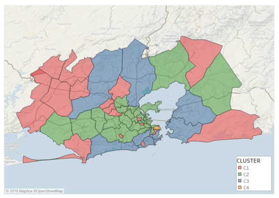 The observed results concur on recent developments in the scientific literature that show how mobile phone information can be used to evaluate the socioeconomic state of spatially heterogeneous regions [43,59,60], especially in developing countries. Moreover, the RJMA is a very particular case study where socioeconomic isolated districts are placed in between richer areas, as well as in the periphery, which is more common in greater cities of developing countries. This particular characteristic of the city allows us to validate the results, as the clusters accurately identified favelas and other socioeconomic isolated districts, as shown in Figure 4.