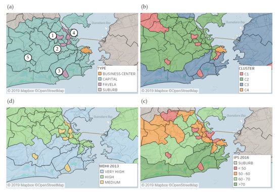 Figure 4c,d show two social development indexes. In Figure 4c, the Municipal Human Development Index (MHDI), which is an adaptation of the Human Development Index (HDI) for municipalities. The MHDI data were obtained from the Atlas of Human Development in Brazil [49], where the MHDI computed in 2013 is available at the census track level as aggregated values for all municipalities and for district level in metropolitan areas. In Rio, the MHDI is available for the macro zones shown in Figure 1 and the value for the five locations of interest in Figure 4a were obtained from the census track level. The classes and colors used in Figure 4c were suggested by the Atlas. All five locations assigned in Figure 4a were classified as medium MHDI, and many locations classified in the high-attractive cluster (C3) have very high MHDI.