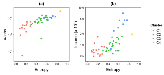 While transportation mobility has largely been recognized as a major player in the urban economy [51], the recent scrutiny of Call Detail Records (CDR)have expanded our understanding of how mobility relates to economic activity across cities [42,52]. We here evaluated how entropy relates to officially reported job numbers and income levels (Figure 5). In spite of the large informal job market known to occur in RJMA, our analysis shows a positive and exponential relationship between formal jobs and entropy (Figure 5a). Similar patterns emerge when relating income level with entropy (Figure 5b) as well as with Gross Domestic Product (GDP) (see Appendix C).