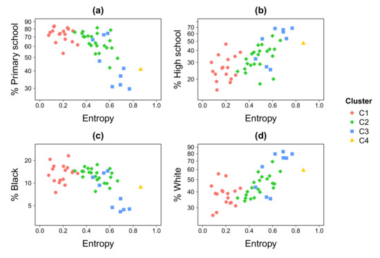 Sociodemographic analysis. Percentage of primary school level education ((a), high school level education (b), black people (c), and white people (d) as a function of the entropy index. The entropy have been averaged over the work-shift time periods on weekdays.