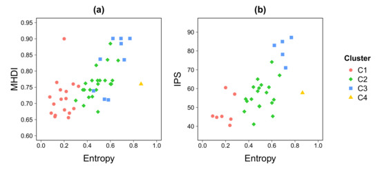 The entropy of visitors, computed from CDR, reflects the complexity of indicators usually computed using classical approaches. In fact, entropy seems to be positively associated with socioeconomic indicators such as MHDI and IPS (Figure 7), as shown in Figure 5 and Figure 6.