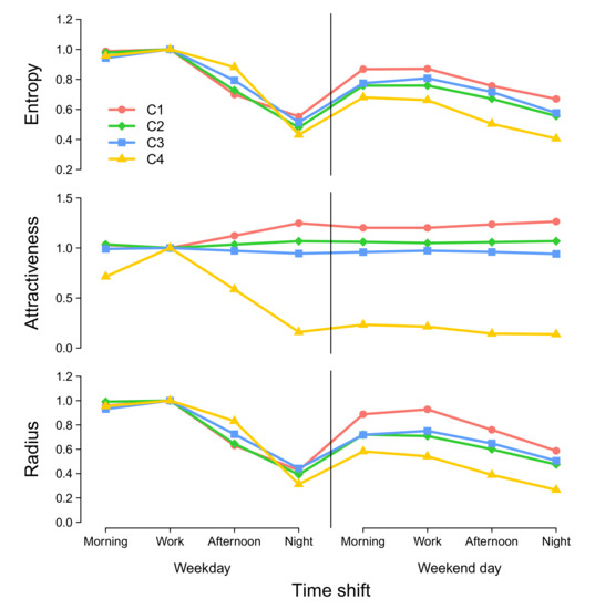 To study the temporal evolution of entropy, attractiveness, and radius of attraction, we plot the normalized average metric values for each cluster across time shifts (Figure 8). Normalizations are performed using the reference values obtained for the work-shift time period on weekdays. We decided here to consider relative instead of absolute values in order to make average attractiveness of clusters of locations comparable over time. Entropy tends to globally decrease along the day on both weekdays and weekends for every location, whatever cluster it belongs to. However, it is interesting to note that the entropy is relatively higher during weekday nights and weekends for locations classified as low-attractive during weekday work shifts compared to highly attractive locations. Indeed, while locations of cluster C4 exhibit an entropy index 50% lower than the reference value, it actually represents 80% for cluster C2/C3 and more than 90% for locations belonging to cluster C1. A similar behavior is observed for the radius of attraction. The situation is slightly different however, for the attractiveness with an increase of the metrics during afternoons and night shifts on weekdays for the low-attractive cluster C1. It further reaches a plateau during the weekend days. The location of cluster C4 shows the opposite behavior, with a decreasing attractiveness along the day to reach a plateau during weekend days. The attractiveness remains more or less constant for locations belonging to cluster C2 and C3.