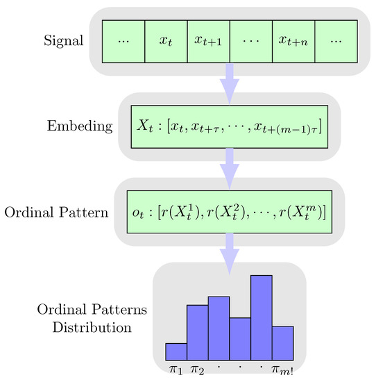 The ordinal pattern is defined by the relationships among values of adjacent data points. Before the calculation of ordinal pattern, the original signal X is embedded with dimension m and time delay , as