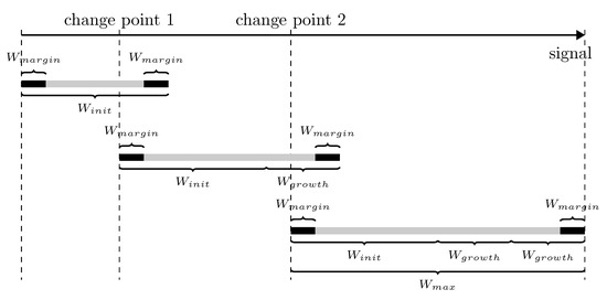 An essential characteristic of the multiple change-points detection is its local nature. The OPD of an audio segment depends only on the ordinal patterns in the range from the previous change-point to the next change-point. The estimated distribution might be biased due to the use of ordinal patterns outside the specific range, which follows different probability distributions. Therefore, a shifting analysis window with fixed length as Equation (23) may deteriorate the segmentation performance. However, as the next change-point of the data point under test is unknown, it is infeasible to use only the ordinal patterns relevant to the current hypothesis testing. Considering the local nature of the multiple change-point detection, we use a searching strategy for change-point with a variable analysis window. At the beginning, we check whether there is a change-point in an analysis window of length . If a change-point exists, the precise location of the change-point is then estimated by Equation (21). Correspondingly, if no change-point detected, we grow the length of the analysis window in steps of until it contains a change-point or reaches the maximum window length . After a successful detection of a change-point, we perform SCPD in a new analysis window of length begin from the detected change-point. If the length of the analysis window reaches the maximum with no change-point detected, we begin a new SCPD from the end of the previous analysis window. We repeat the test and obtain multiple change-points sequentially until the analysis window reaches the end of the signal. In Figure 2, we illustrate the local search strategy with a variable window.