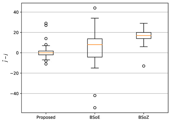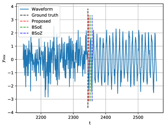 As shown in Figure 5, the mean of computed by our method is approximately 0, while that of the BSoE and the BSoZ are about five and 15, respectively. The comparison of the mean of indicates that our algorithm detected change-point with more precise locations. One explanation for this is that both the BSoE and the BSoZ require a short-term window to calculate the acoustic features. Instead, the proposed method computes ordinal patterns from only m data points on the waveform. As , our method has a higher temporal resolution. In addition, Figure 5 also shows that the proposed method has the smallest standard deviation of , which indicates the robustness of the proposed method.