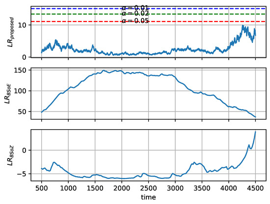 As there is no change-point in or , we investigate the log-likelihood ratio () of the hypothesis test. The log-likelihood ratio at each data point in and is shown in Figure 6 and Figure 7, respectively. The existence of change-point is tested by whether the log-likelihood ratio exceeds the corresponding critical threshold. According to Equation (21), the critical threshold of the proposed method relies on the significance level . Three critical thresholds are shown in Figure 6 and Figure 7, corresponding to , , and . According to Equation (28), the thresholds of the BSoE and the BSoZ are both 0.