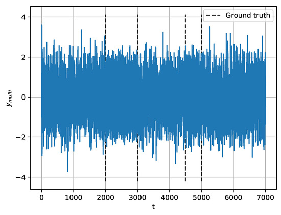 In this section, we investigate the performance of the proposed method for MCPD. Using Equation (31), we generate synthetic signals with four change-points at 2000, 3000, 4500, and 5000, as shown in Figure 8: