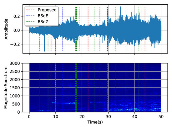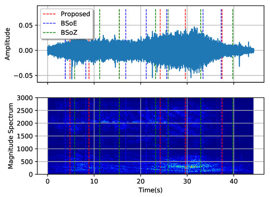 Figure 10 and Figure 11, respectively, show the results of MCPD conducted on the two typical SRN records. The first record comes from a passenger ship entering the port, and the second comes from a pilot boat passing by the hydrophone. The spectrums are calculated from the amplitudes of the short-time Fourier transform, with a short-term window length 512 sampling intervals and a hop length 256 sampling intervals. Figure 10 and Figure 11 show both the waveform and the corresponding spectrum of the two records, describing the signal from aspects of the time domain and frequency domain. The dotted lines show the locations of the estimated change-points. Shifts in both the waveforms and the corresponding spectrums of the two records are evident, but no apparent change-point exists. The three methods obtain different change-points using distinct elementary features and criteria. The BSoE tends to detect a change-point where the amplitude changes while the BSoZ inclines to report a change-point where the spectrum changes. Although the proposed method does not make use of the amplitude and frequency of the signal, it also obtains satisfactory segmentation results according to the OPD.