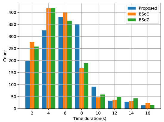 Time duration histogram of audio segments obtained by the three algorithms.