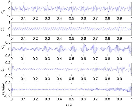 For comparison, ASNBD, ASTFA, and CEEMD are utilized to analyze the signal . The results are shown in Figure 3, Figure 4 and Figure 5, respectively. In Figure 3, the first two components are obviously false high-frequency components with weak energy only at the two end-point part, which may be generated due to the decomposition procedure, and the third component and the fourth component are consistent with the true components. Therefore, the two components are very useful component. Although the obtained components using ASTFA technique also reflect the real components (shown as ,) in Figure 4, their energies reduce a lot and their waveforms exhibit a big deviation relative to the true component. From Figure 5, it can be seen that the real component sare not successfully derived by the CEEMD technique. At the same time, the further calculation shows that the correlation coefficient of and is 0.9824, and correlation coefficient of and is 0.9875 by using ASNBD, while correlation coefficient of and is 0.9452 and correlation coefficient of and is 0.8000 by using ASTFA. Therefore, it can be concluded that ASNBD can achieve more accurate decomposition results than ASTFA and CEEMD method.