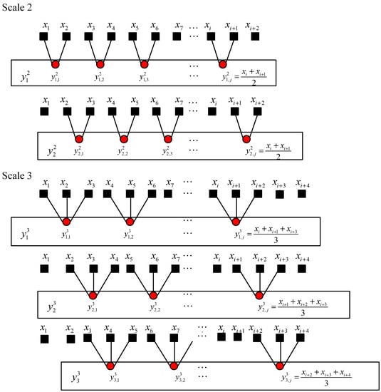 (1) To obtain coarse-grained time series at scale factor , the coarse-graining procedure can be demonstrated as shown in Figure 6, from which it can be seen that coarse-grained sequences are obtained from different start points. The original time series is divided into several segments and the element of the coarse-grained time series can be built by the following equation: