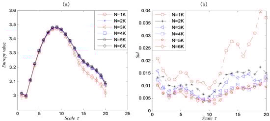 where is the length of the synthetic signal and the sample frequency is KHz. We employed to simulate a signal of a faulty rolling bearing, in which, KHz, Hz and the periodical impulse is expressed by , is simulation time. indicates the AM–FM signal, is a sine signal, and is white noise. According to the principle of parameter selection mentioned above, considering the calculation time and information richness, we choose the parameters as , , and . Figure 7a,b record the statistical property of the RCMDE value changes with , from which we can draw the following conclusion. Firstly, the entropy values have the similar trend with time scales no matter how long the dataset is. Secondly, when is more than , the obtained results are almost same. Lastly, from Figure 7b when the data length ranges from to , the standard deviation (Std) decreases with increasing, but when the data length is more than 5000, the standard deviation goes up at some scales. Hence, based on the above analysis, we use .