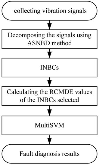 When a variety of failures occur in mechanical system, the vibration signals acquired by sensors represent the nonlinear and nonstationary characteristics and the energy distribution will change with different working states, resulting in the variety of the complexity of times series. Here, a novel-fault diagnosis-model is developed by combining the ASNBD method with the RCMDE algorithm in this paper. Firstly, a nonlinear and nonstationary vibration signal is decomposed into a series of the INBCs. Secondly, the RCMDE values from the relevant INBCs are extracted as fault features. In the end, of fault diagnosis process, basic multiSVMis employed as class discrimination technique to identify different fault type and location. The proposed fault diagnosis scheme for rolling bearing is given in Figure 8. The specific steps for the proposed scheme are given as follows.