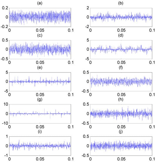 Time domain vibration signals for rolling bearing under: (a) normal state; (b) inner race fault (IRF)1; (c) ball fault (BF)1; (d) outer race fault (ORF)1; (e) IRF2; (f) BF2; (g) ORF2; (h) IRF3; (i) BF3; and (j) ORF3.