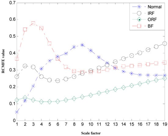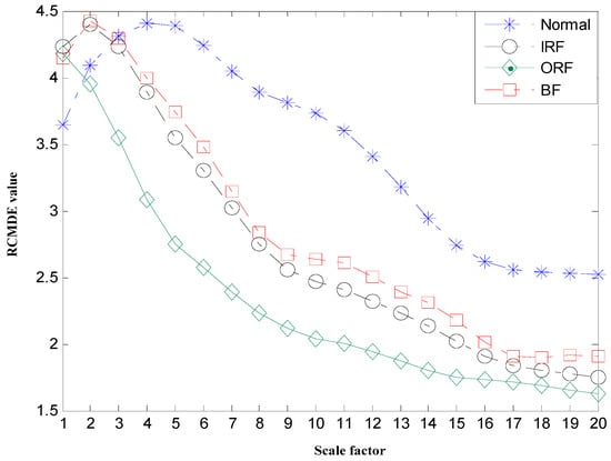 It is an important issue to select appropriate parameters for entropy-based approach. There are four parameters, including the embedding dimension , the number of classes , the time delay and the maximum scale factor . In general, it is recommended because when d > 1 some important information in terms of frequency may be discarded, which might lead to aliasing for practical work, and the number of class must be bigger than 1, because when c = 1, there is only one dispersion pattern []. Moreover, in order to obtain reliable statistics, the number of potential dispersion patterns should be smaller than the length of the signal (). When is too large, a slight difference between amplitudes would change their class to obtain different dispersion entropy values, which may result in high sensitivity to noise. However, when is too small, the amplitudes that are far from each other may be regarded as the same class and thus cause inaccurate value. When the embedding dimension is too small, the dispersion entropy might not detect the dynamic changes. Although a bigger can capture more information, too large might need a longer data. In general, the length of data is between and . Moreover, too large a or may consume more computation time. According to our research, when the parameter is 4–10, similar results can be obtain. In addition, when the parameters and changed under the condition of , the results were similar. For more information about the parameters , , and , please refer to the literature []. For the scale factor , it needs to be set according to the actual situation. Simultaneously, for RCMDE, since the coarse-graining process shorten the length of a signal to , the requirement must be met.