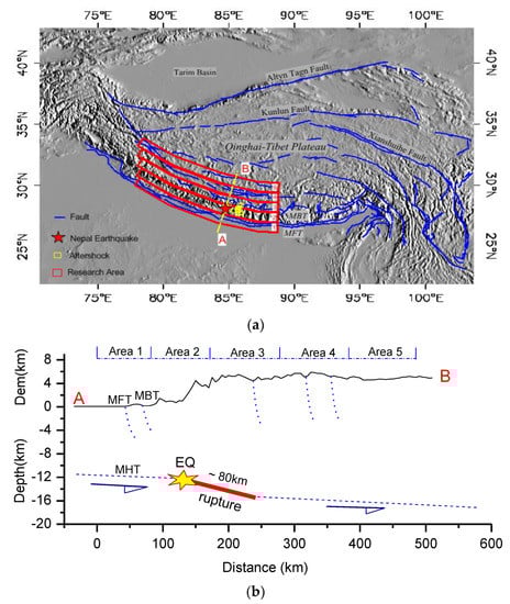 On 25 April 2015, the Mw 7.9 earthquake in Nepal occurred in the Southern foothills of the Himalayas. The epicenter of the mainshock was at 84.708 °E, 28.147 °N, and the initial rupture depth was approximately 12–15 km []. The aftershocks () that occurred on 25 April 2015 were given in Figure 1a. The focal mechanism solution indicates that the earthquake was a low-angle thrust-type earthquake []. Field investigations have not found that the Mw 7.9 earthquake in Nepal formed a surface rupture zone on the main fault in the Southern foothills of the Himalayas. The tectonic nature of the Southern foothills of the Himalayas is a thin-skin structure, which is characterized by the steepening slope of the shallow fault (approximately 7°) and the deep fault (approximately 11°).