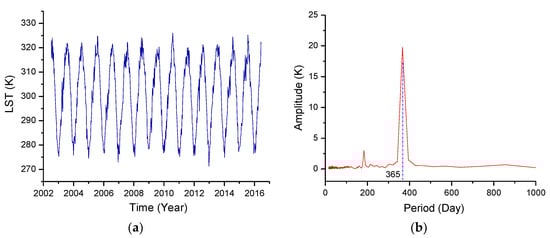 Variations in land surface temperature (LST) with time (a) and its spectrum distribution (b). Latitude and longitude: 93.7° E, 37.9° N.
